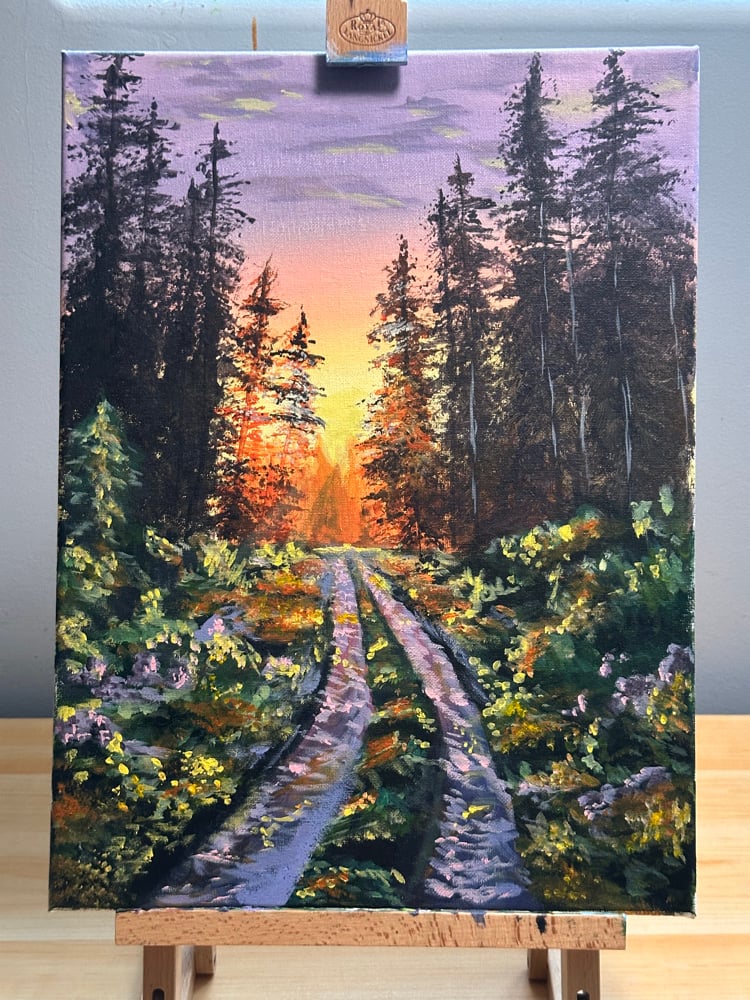 This painting captures a quiet moment of transition, where a narrow path leads through dense forest toward a fading sunset. The softened light and muted tones emphasize stillness rather than destination, inviting the viewer to linger in the in-between space rather than rush forward.