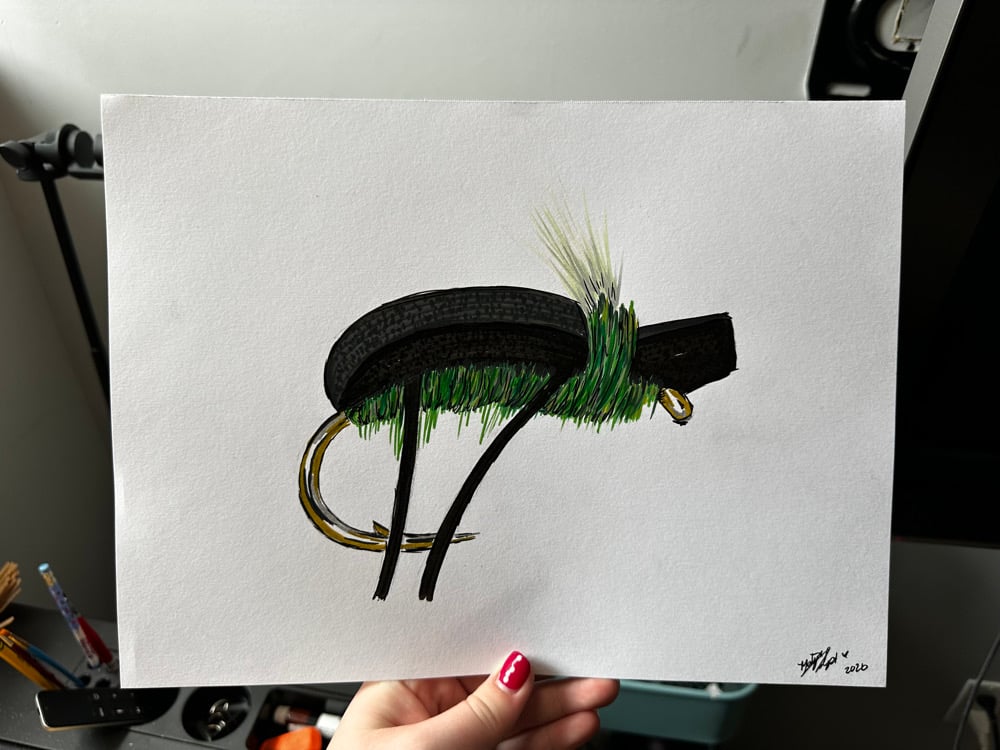 This series focuses on hand-painted and drawn studies of fly-fishing patterns, each treated as both a functional design and a small portrait. While the flies themselves vary in color, structure, and style, the intent remains the same: to slow down and honor objects that are usually seen only in motion or utility.